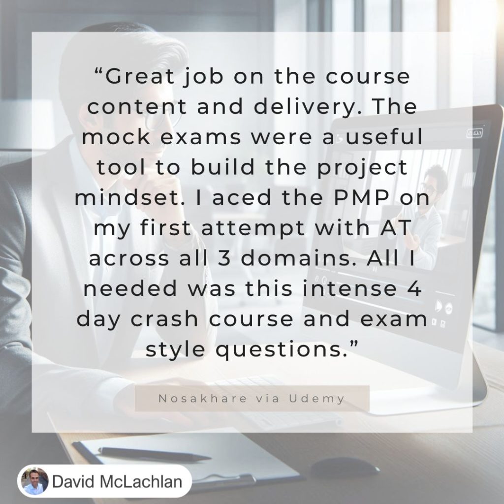 “Great job on the course content and delivery. The mock exams were useful to build the project mindset. I aces the PMP on my first attempt with AT across all domains. All I needed was this intense 4 day crash course and exam style questions.” – Nosakhare – PMP Course on Udemy.