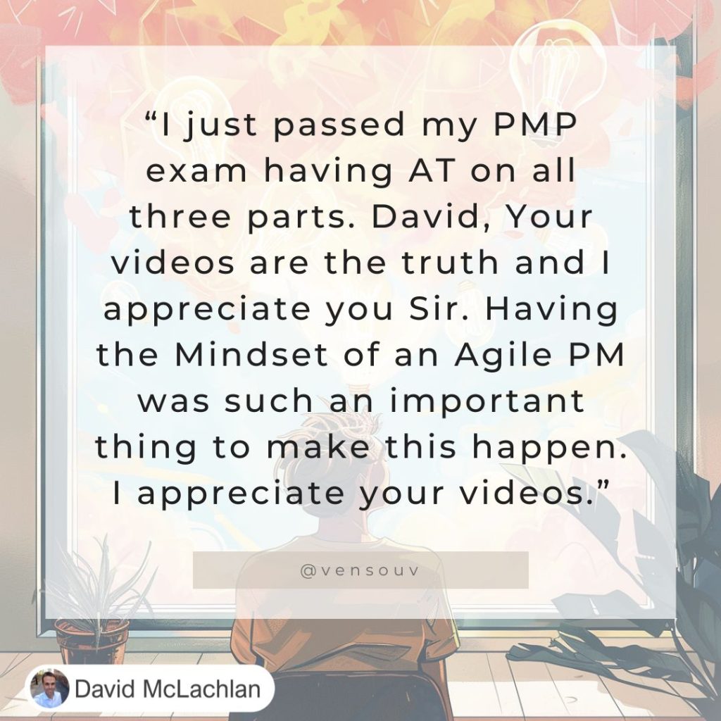“I just passed my PMP exam having AT on all three parts. David, your videos are the truth and I appreciate you Sir. Having the mindset of an Agile PM was such as important thing to make this happen. I appreciate your videos.” – Vensouv
